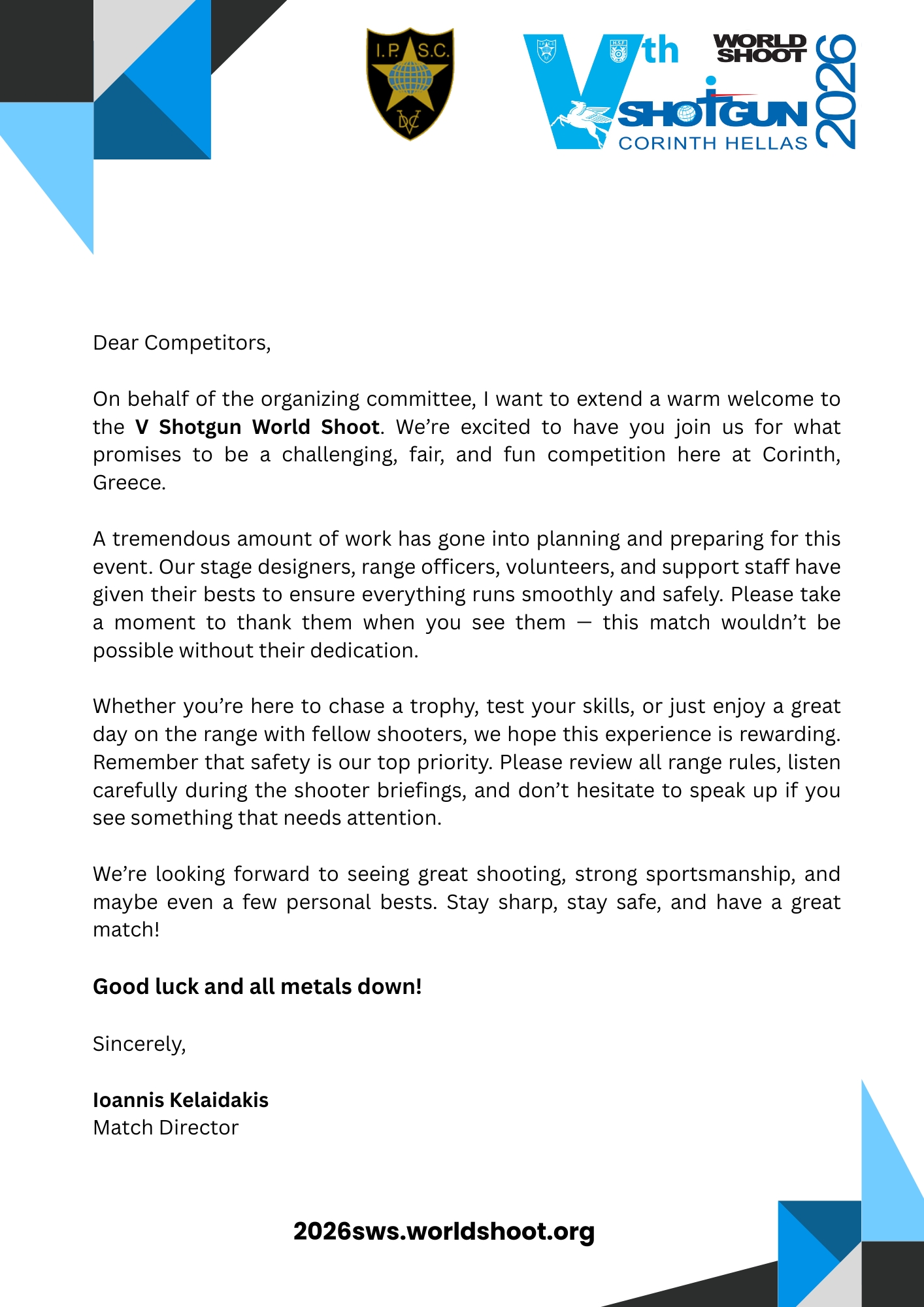It’s a great honor for me to invite you to the 2026 V Shotgun World Shoot in Corinth, Greece.